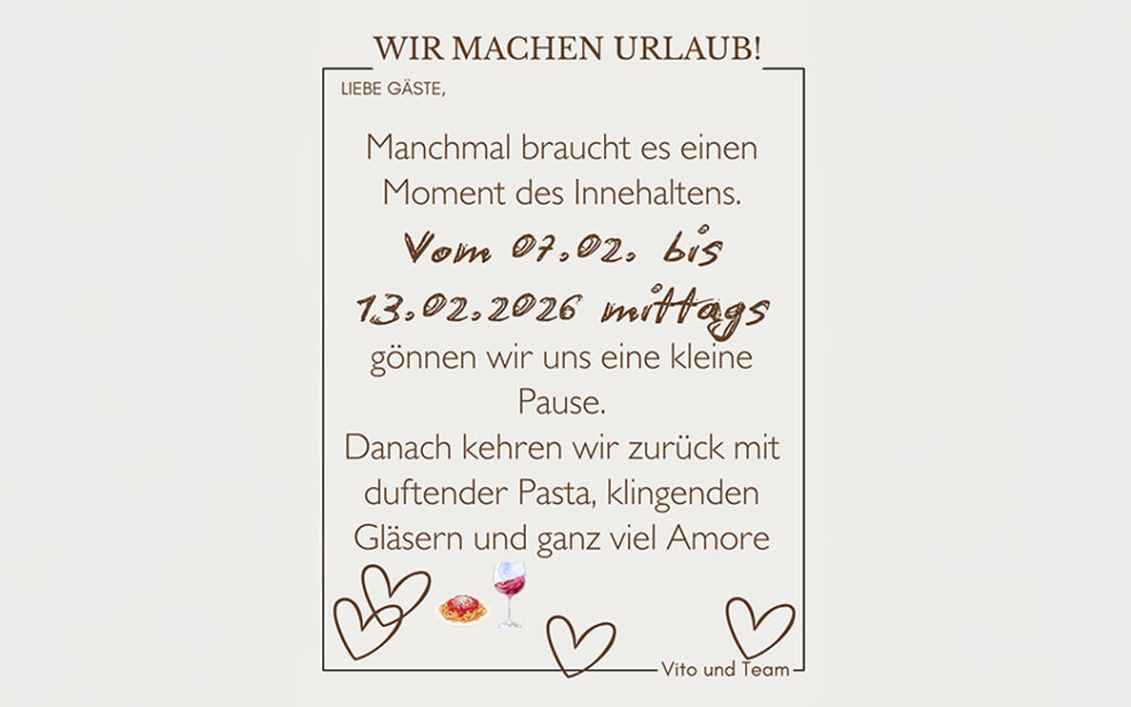 Wir machen Urlaub Liebe Gäste, manchmal braucht es einen Moment des Innehaltens. Vom 07. Februar bis zum 13. Februar mittags gönnen wir uns eine kleine Pause! […]